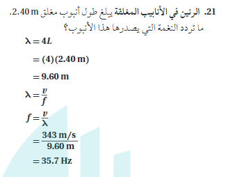الرنين في الانابيب المغلقه يبلغ طول انبوب مغلق 2.40m ما تردد النغمه التي يصدرها هذا الانبوب