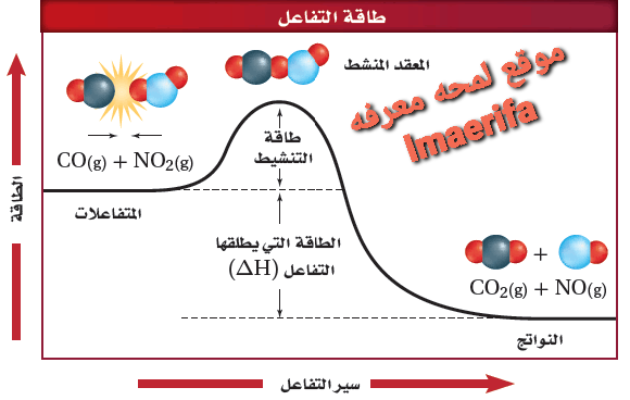 - وفى هذة الحالة تتصادم جزئيات CO , NO2 مع وجود كمية كافية من الطاقة لتتغلب على هذا الحاجز وتكون طاقة النواتج أقل من طاقة المتفاعلات .