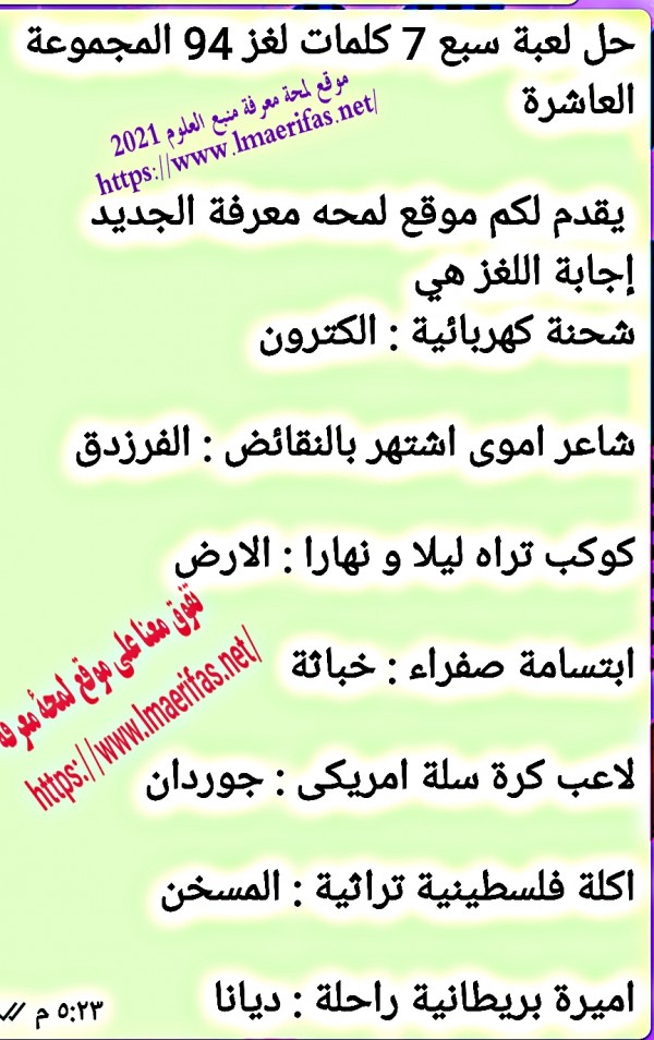 ونستمر في البحث حول الأجوبة المختصر التي تفيد الزائر بشأن هذا السؤال المطروح في الموقع، ونعلم أنك تنتظر الجواب أو المعرفة لسؤال حل لعبة سبع 7 كلمات لغز 94 المجموعة العاشرة