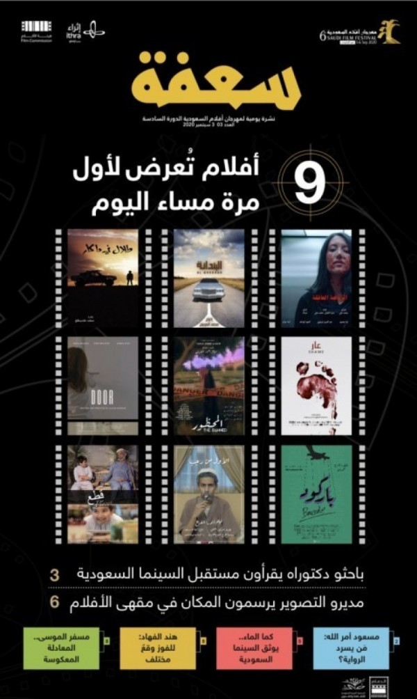 ويختتم المهرجان الذي تنظمه جمعية الثقافة والفنون في الدمام بالشراكة مع مركز الملك عبدالعزيز الثقافي العالمي بالظهران «إثراء»، وبدعم من هيئة الأفلام التابعة لوزارة الثقافة في 6 سبتمبر.